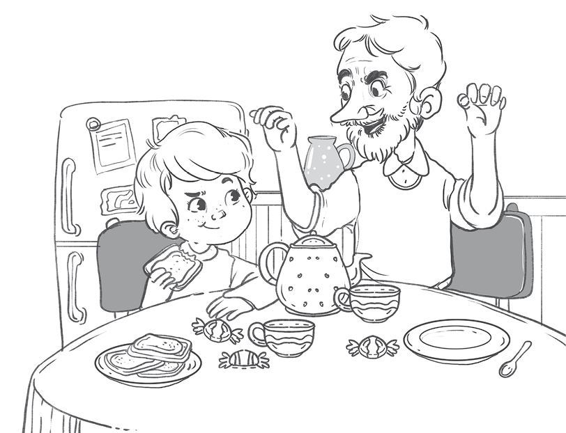 Я опять отхлебнул чай, а сам думаю, как родителям сказать, что с дедом творится что-то страшное. Наверное, у меня лицо очень испуганное было, потому что дедушка как надует щёки! Лицо у него покраснело. Точно, значит, смеяться будет! Он держится за живот и хохочет: