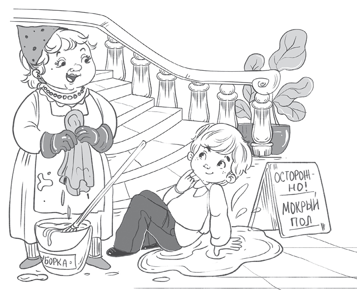 После урока технологии я пошёл к Андрей Андреичу, директору. Поскользнулся на лестнице – её только-только помыли, – но почти не ударился и не испачкался. Уборщица услышала моё смелое «ай» при падении, подбежала и давай меня жалеть и к своему грязному синему халату прижимать: