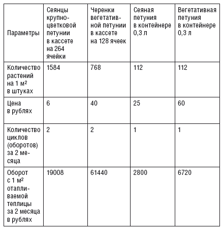 Давайте рассмотрим пример оборота, который вполне реален при выращивании петунии на одном квадратном метре (табл. 1). Исходный материал может быть разный: семена, черенки и так далее. Семенами размножаем более простые формы, они доступнее для начинающих растениеводов. Вегетативно (то есть частью растения, черенками) размножаются преимущественно необычные гибриды с интересной окраской или размерами. Растения, размножаемые вегетативно, всегда дороже, чем семенные.