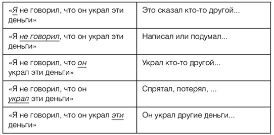 Пример. Рассмотрим, что домыслит слушатель, если говорящий будет по-разному расставлять акценты в одной и той же фразе: «Я не говорил, что он украл эти деньги». Проверьте себя.
