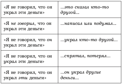 Эксперимент 1: что домыслит слушатель, если говорящий будет по-разному расставлять акценты в одной и той же фразе: «Я не говорил, что он украл эти деньги». Проверьте себя…