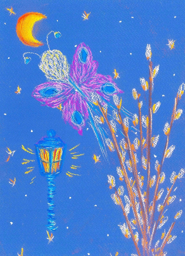 A fluffy willow branch was dozing in a Venetian vase on the windowsill, when a delicate Butterfly appeared on it. The Girl, who couldn’t fall asleep, got up from the bed and went to the window.