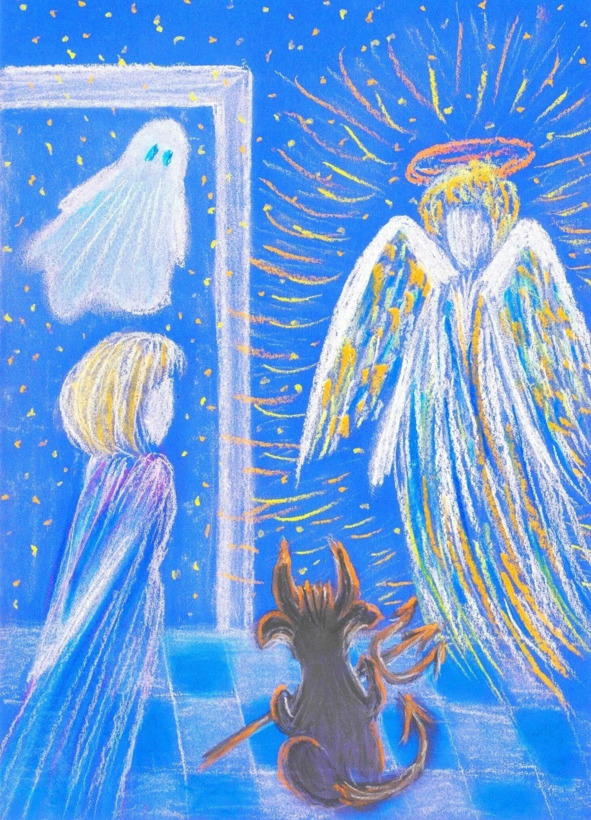 The resuscitators rushed into the room and took away Lyudmila’s body, while her soul with the Angel and the Demon followed the body to the intensive care unit to continue the conversation there.