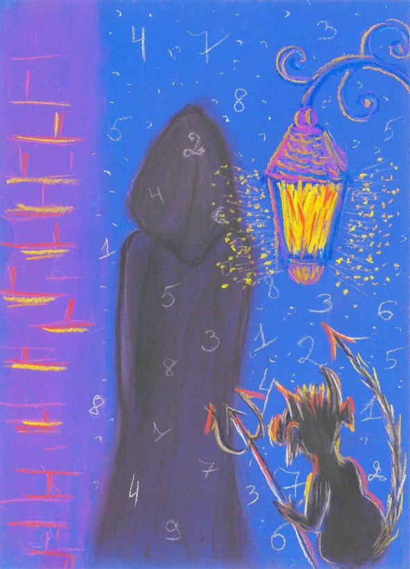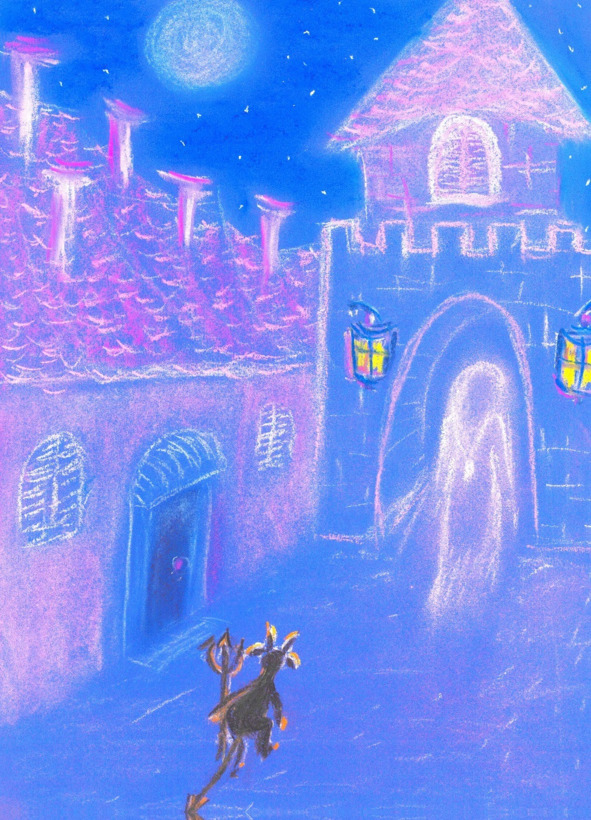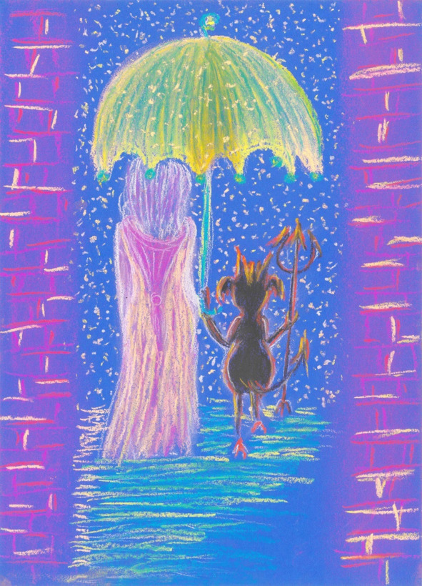 Вскоре бабушка свернула в узкую улочку, мощёную камнем, которая от нахлынувшего тумана окрасилась в серо-голубые тона. В конце улицы находился небольшой бар. И я, следом за бабушкой, зашла внутрь. Там было полно народу, но откуда столько… чертей?! Вокруг почти каждого гостя кружилось как минимум двое хвостато-рогатых, что-то нашёптывающих тому в оба уха.