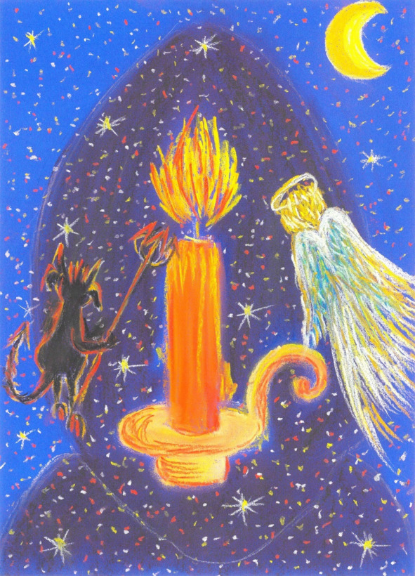 Вульгарные полуобнажённые женщины с рожками поменьше танцевали у столиков и вальяжно расхаживали по заведению. Моя бабушка в одежде монахини, смотревшаяся на их фоне совершенно дико, не обращая ни на что внимания, молча провела меня в дальний угол к седому падре, сидящему в одиночестве за столиком у окна со свечой и псалтырью. Падре жестом пригласил нас присесть рядом.