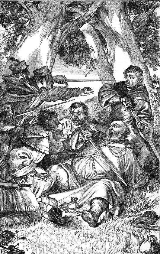 Принц Генрих и Пойнс в масках нападают на Фальстафа, Гедсхила, Бардольфа и Пето.