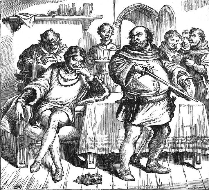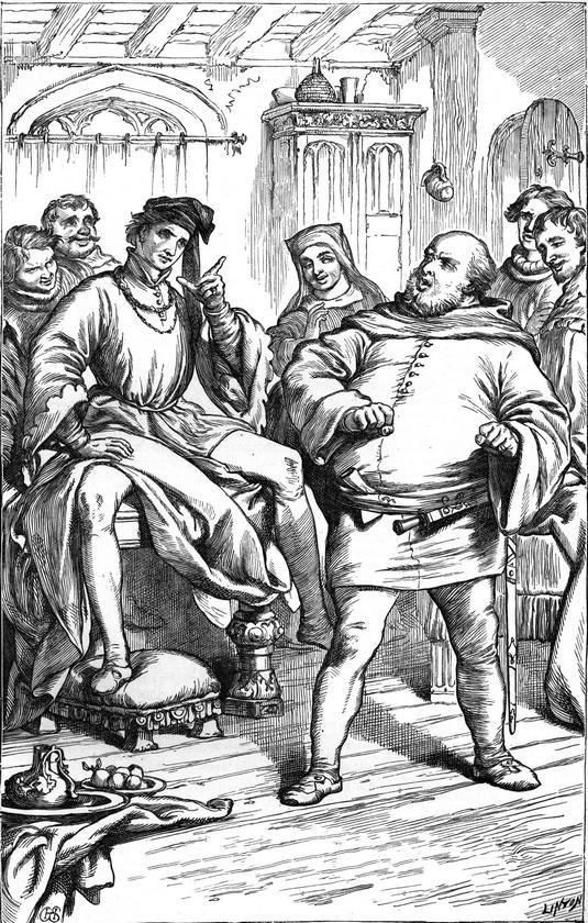 Входит буфетчик и сообщает, что у дверей стоит «этот старикашка сэр Джон» с группой товарищей. Сэр Джон – это Фальстаф.