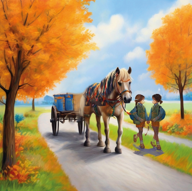 Прошло немного времени; довольные, неся в школьном фартучке собранную траву, вернулись обратно. Лошадки на месте не было. Где она? Девочки переглянулись. Вместе с бидонами лошадка увезла и лежащие в повозке ноты. Что теперь сказать маме, где оставили тетради? Мысли путались в голове. А как же лошадка? Они не успели её покормить…