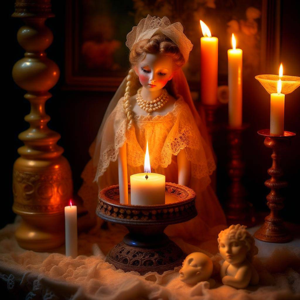 Странности продолжились, когда молодые родители по возвращении домой обнаружили в столовой сидящую на бюро старинную фарфоровую куклу в белом платье, украшенном антикварными кружевами (такая стоит несколько тысяч долларов, прикинул Вэлиант). Перед куклой в центре фарфорового блюда лежала записка, на ней стоял бокал воды, на дне которого Вэлиант разглядел серебряный доллар, вокруг бокала были установлены семь свечей.