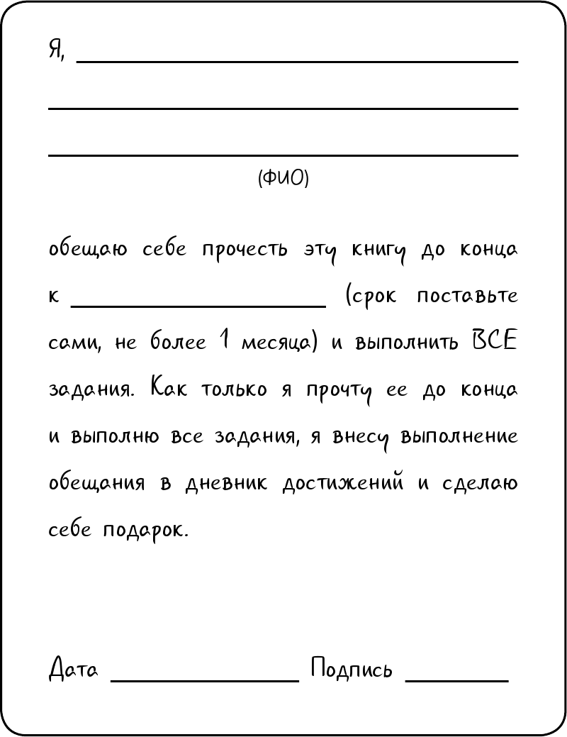 Обещание, данное самой себе и выполненное, – это кирпичик, который укрепит вашу уверенность в себе и собственных силах. Сейчас вы закладываете фундамент, и каждое следующее задание будет надстройкой над ним.