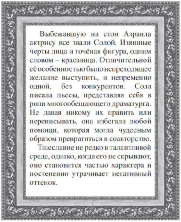 Все взгляды были устремлены на сцену. Сегодняшняя премьера привлекла в театр большое число зрителей: выступал один из лучших актеров современности, подававший, как считали многие заядлые театралы и критики, надежды бессмертным векам. Звали его Азраил. Хотя помимо Азраила в пьесе было задействовано много других актеров, к его игре относились с особым вниманием. Напряженное, оно скользило по залу.