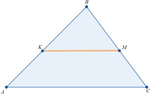 Средняя линия (K M) – это отрезок, который соединяет середины сторон, т.е. K – середина AB, M – середина BC.