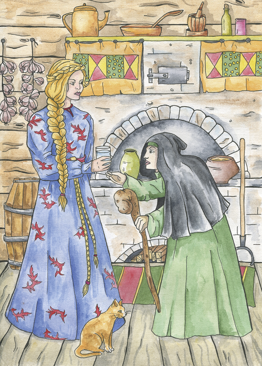 – Ой ты, красна девица. Будь добра, дай воды испить. Притомилась я с дороженьки. Разболелися мои ноженьки.