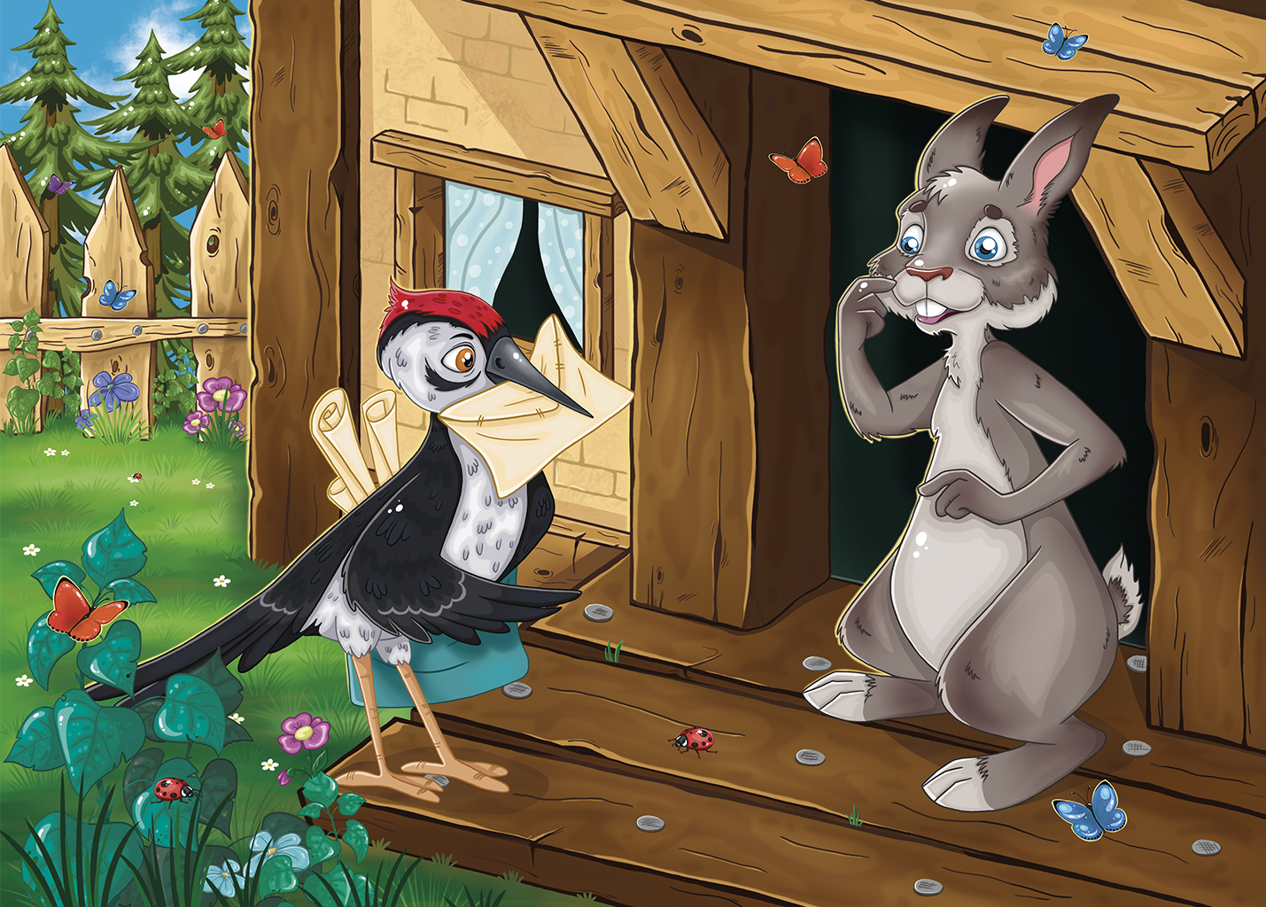 Однажды в окно к весёлому Зайцу постучался Дятел. Улыбайка сразу же проснулся, сладко потянулся, протёр лапками глазки и бодро поспешил к двери.
