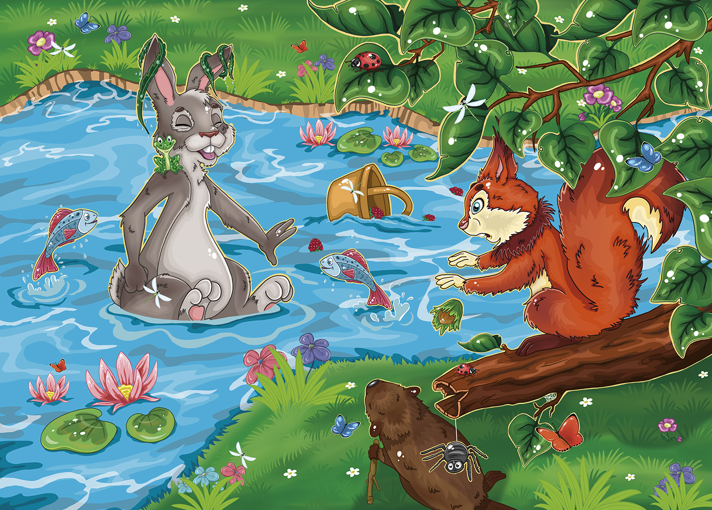 Улыбайка выбрался из кустов и пошёл по дорожке. Шёл он, шёл, грыз морковку. Жизнь хороша… Жить хорошо… Над ним летели быстрокрылые облака, он любовался небом… Вдр-р-руг – плюх!!! Вокруг вода… Мечтатель влетел в Ручей. Сначала испугался, а потом как захохочет. Рыбки попрыгали из воды.