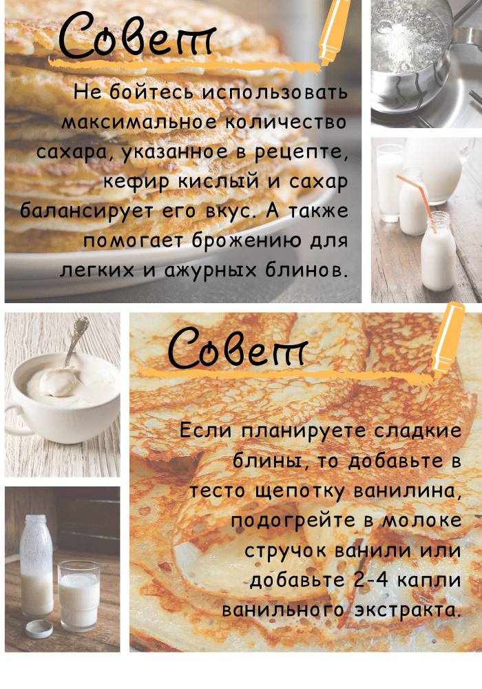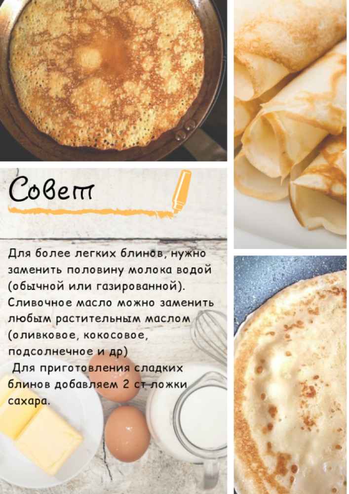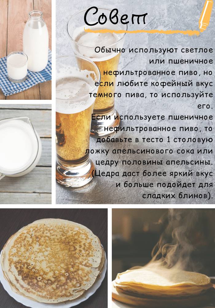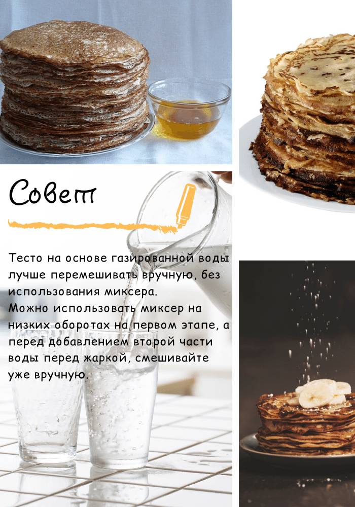 Этот блок раскрывает использование газированной воды или пива в тесте. Газы от напитков делают тесто легким и воздушным, блины получаются ажурными и тонкими.