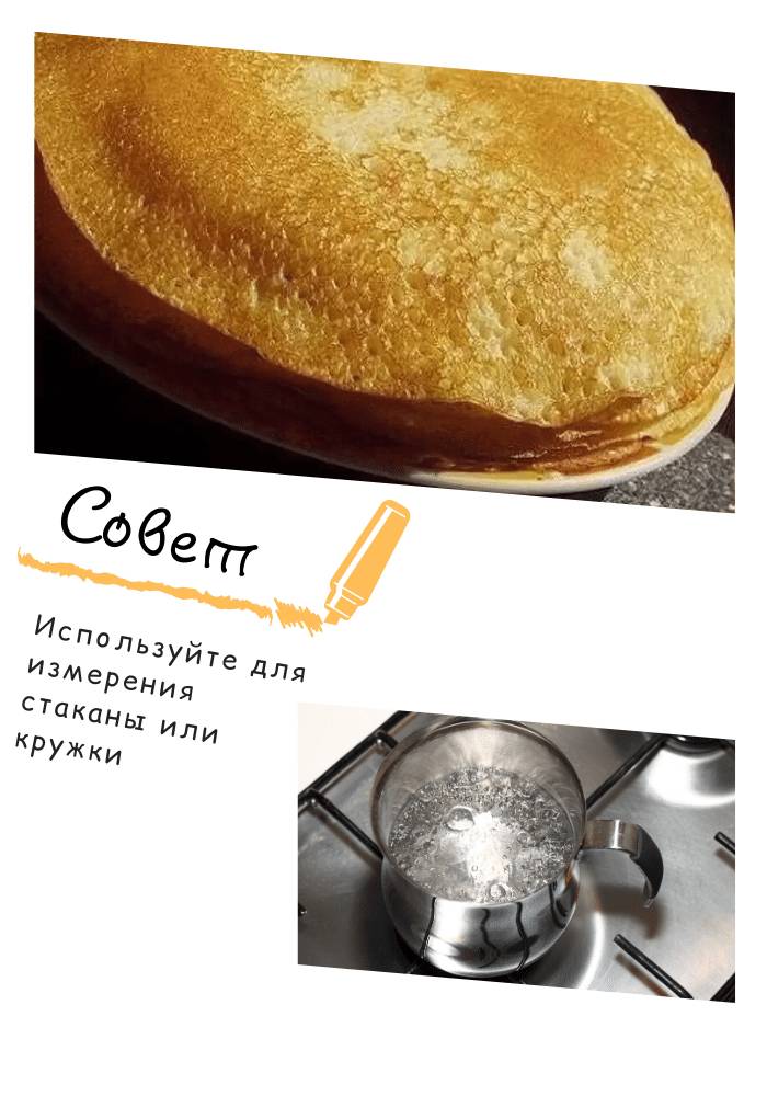 Эксперименты с едой ограничиваются только лишь Вашим воображением и вкусами! Меняйте составы и ингредиенты, сочетайте разные продукты, кухонный стол может на несколько часов стать Вашим местом для творчества, генератором хорошего настроения и благодарности от Ваших родных и близких. Только в процессе изменения соблюдайте основные пропорции между жидкими и сыпучими ингредиентами. Так, например, соотношение воды (молока) и муки для хлебного теста или булочек в среднем всегда должна быть 70% на 30% (принимаем все тесто за 100%). Блинное тесто имеет жидкую консистенцию, поэтому в среднем жидкости должно быть в 2 – 2,5 раза больше, т.е. на 500 грамм муки нужно будет 1-1,5 литр воды. Помните это, если планируете приготовить больше или меньше теста, чем заявлено в рецепте.