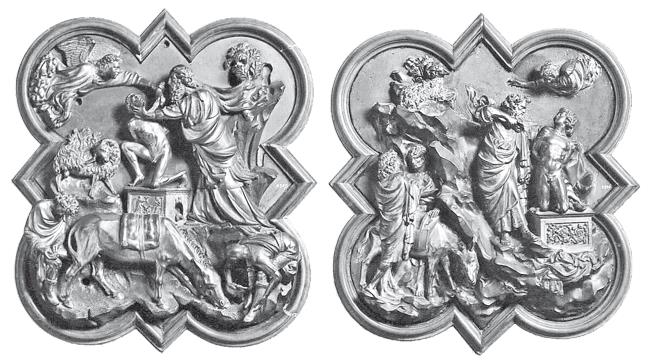 Оба рельефа были настолько хороши, что комиссия оказалась в затруднительном положении. Панель Брунеллески впечатляла своей экспрессией и драматизмом, а также реалистичностью и убедительностью деталей: Авраам, готовый нанести решающий удар; ангел, хватающий руку отца; слуга, вытаскивающий занозу из ноги. Рельеф Гиберти отличался мягкостью линий, плавностью движений, гармоничной композицией, особенно выразительным получился образ прекрасного и гордого Исаака. Оба участника были объявлены победителями, но заказ отдали Гиберти, поскольку технологически его рельеф был совершеннее, его можно было отлить целиком, тогда как Брунеллески отливал фигуры отдельно. К тому же работа Гиберти была значительно легче и экономичнее, а бронза была очень дорогим материалом.