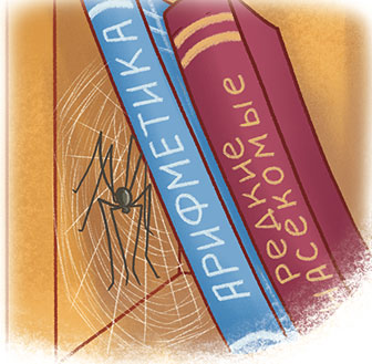 – Вон там, в верхнем углу, под учебником арифметики, паутину сплёл.