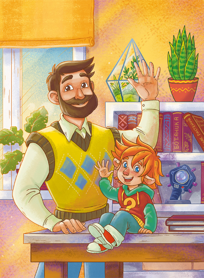 Здравствуйте, ребята! Меня зовут Чевостик. Я живу на книжной полке в библиотеке у дяди Кузи. Не удивляйтесь: я небольшого роста, а нижняя полка в книжном шкафу дяди Кузи очень высокая и просторная, поэтому мне на ней хорошо и удобно. Какой я? Похож на обыкновенного мальчишку, волосы рыжие, характер весёлый. Дядя Кузя в шутку зовёт меня Чевочкой с хвостиком. Но никакого хвоста у меня нет, зато есть ушки на макушке. Больше всего на свете я люблю узнавать новое, поэтому всё время задаю дяде Кузе всякие вопросы. О чём бы я ни спросил, он всё знает и мне рассказывает. Это потому, что дядя Кузя очень умный. Он прочитал много-много разных книг. А ещё мы с ним любим путешествовать! В путешествиях нам помогает времяскок. Это такой прибор, его дядя Кузя изобрёл. Набираешь на времяскоке место и время, куда хочешь попасть, раз, два – и уже там! Сегодня мы наверняка тоже куда-нибудь отправимся!