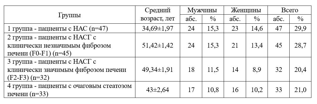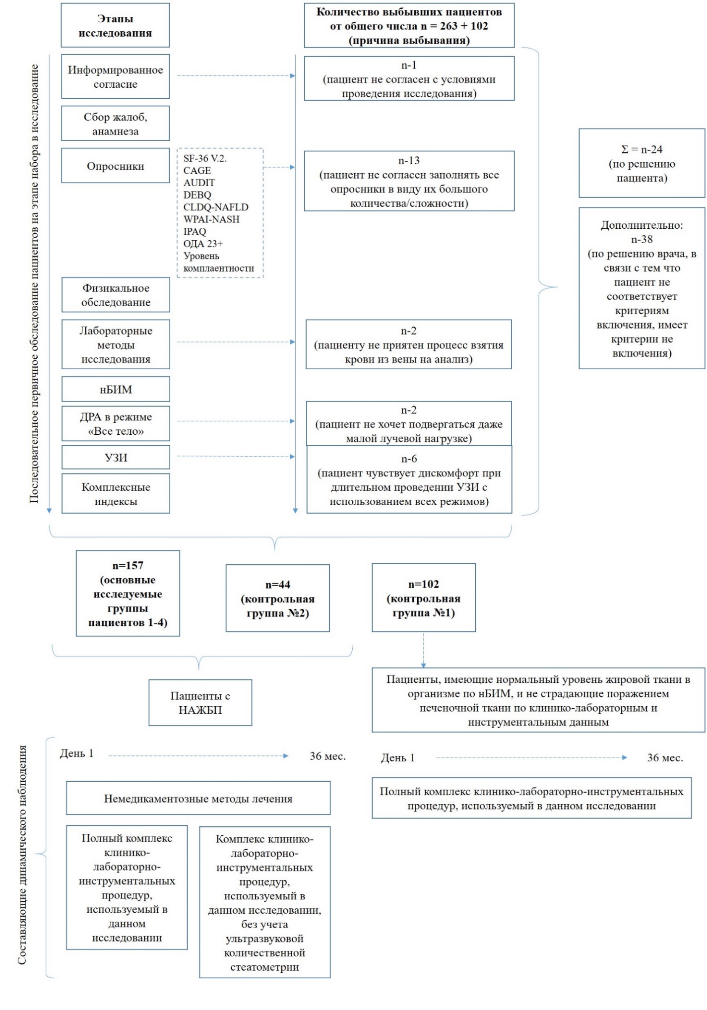 38 пациентов были исключены из исследования на этапе набора в связи с их несоответствием критериям включения и/или наличием критериев исключения. 24 пациента прекратили участие в исследовании и отозвали свое информированное согласие за счет субъективного ощущения личной неспособности полноценно участвовать в программе немедикаментозного лечения, запланированного в данном исследовании. Таким образом, в клиническую (исследуемую) группу по завершению этапа набора были включены 157 пациентов, в контрольную группу №2 (пациенты с неалкогольной жировой болезнью печени) – 44.