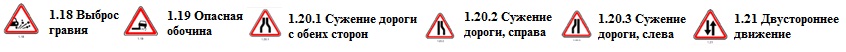 1.20.1 – 1.20.3 «Сужение дороги». Сужение с обеих сторон – 1.20.1, справа – 1.20.2, слева – 1.20.3.