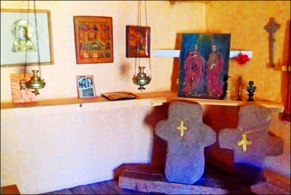 Каменные кресты в часовне святых Флора и Лавра в деревне Сафронова Гора. Фото автора, апрель 2021 г.