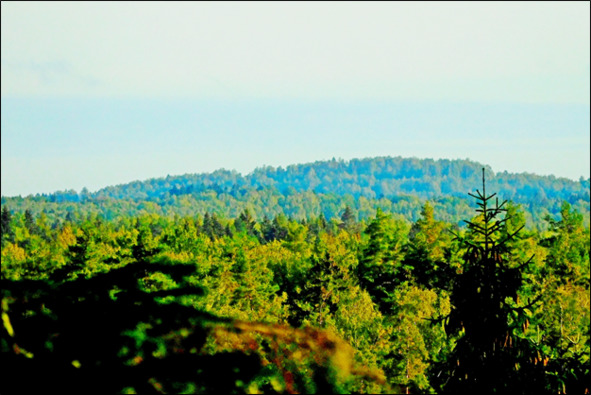 Сначала мы пошли в северо-западном направлении, по юго-западному склону моренной гряды, в направлении вершины Маячной горы. Когда-то на этой горе стояла геодезическая вышка, за что её и называют Маячной или просто Маяком. С этой горы, в просвете между ёлок, хорошо просматривается самая высокая вершина Лужской возвышенности – гора Кочебуж (204,8 м), до неё отсюда по прямой семь с половиной километров. Северный склон Маячной горы очень крутой, на глаз высота от подошвы составляет метров тридцать.