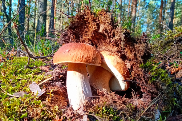 Возвращаясь обратно по противоположному склону моренной гряды, вдруг послышался хруст веток среди деревьев. На мгновение мы приостановились, всматриваясь в ту сторону, но когда продолжили движение, то вдруг оттуда с шумом взлетела глухарка. Чуть далее с земли, из маленьких сосенок, взлетели ещё два глухаря-петуха. В сосновом бору на моренной гряде, среди мха, я нашёл несколько белых, в маленьких берёзках – с пяток крепеньких подберёзовиков, а на краю пропаханной противопожарной полосы – два больших боровика со сросшимися шляпками.