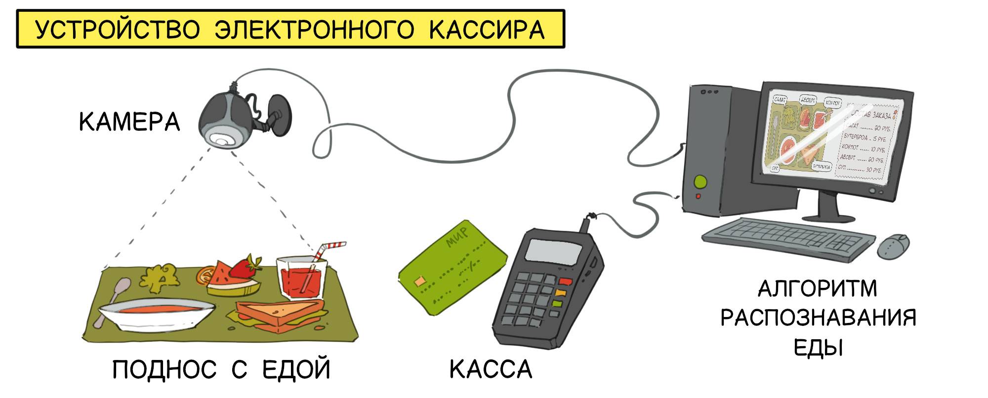Итак, для модернизации столовых нужен программно-аппаратный комплекс, позволяющий распознавать еду на подносе. Звучит угрожающе, но по факту речь идет об обычной веб-камере, подключенной к компьютеру и кассовому аппарату. Цель такого комплекса – автоматически выписывать чек, фиксируя и анализируя то, что находится на подносе клиента. Рассмотрим его составляющие пошагово.