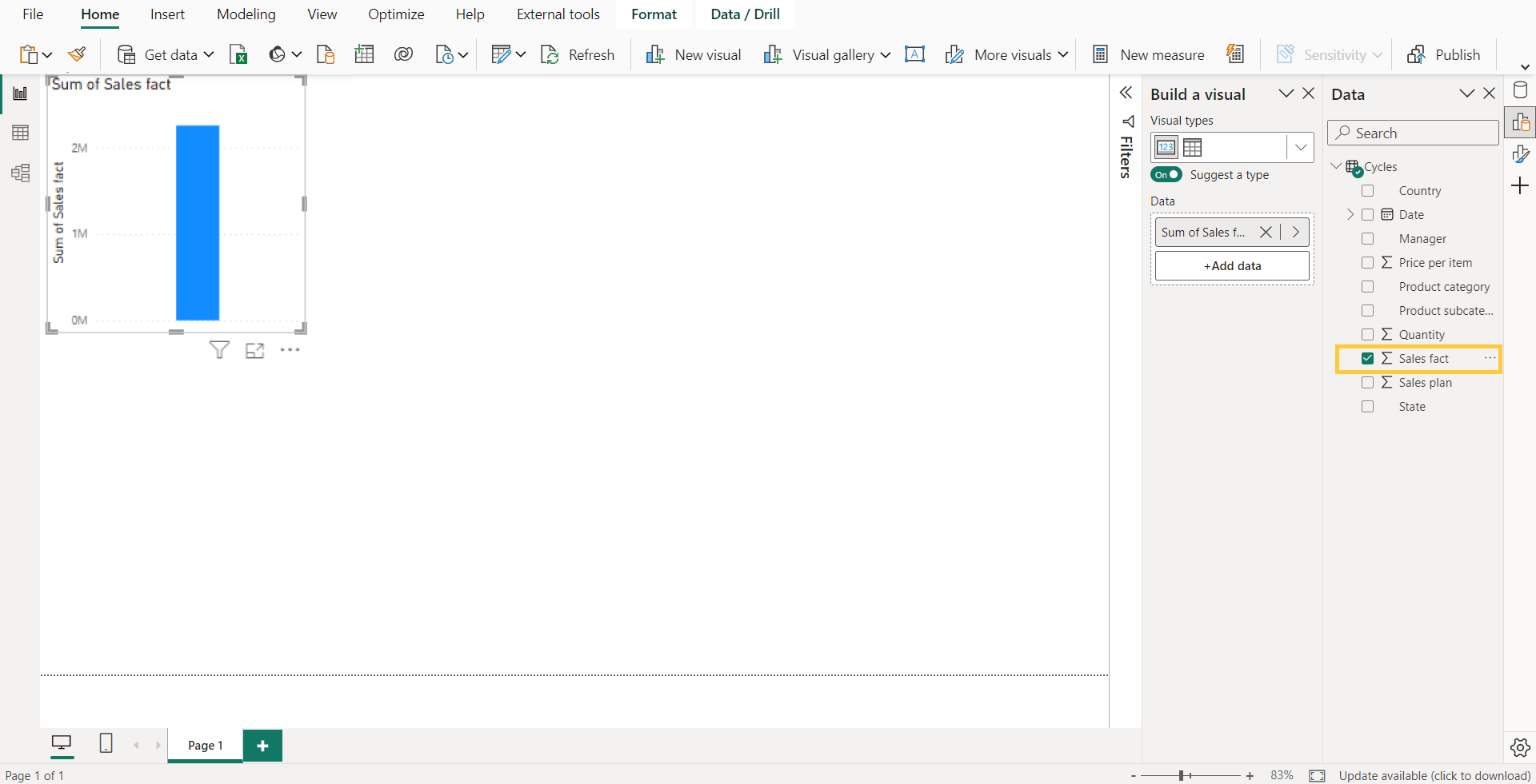 Давайте построим нашу первую визуализацию. В области данных выберете поле Продажи факт. Вы увидите, что на рабочей области сразу появится диаграмма с одним столбцом (рисунок 1-12).