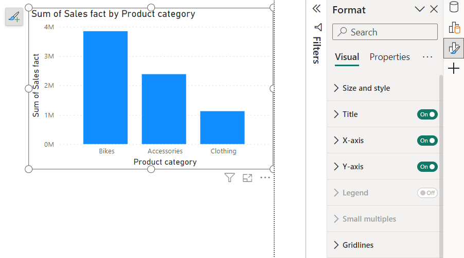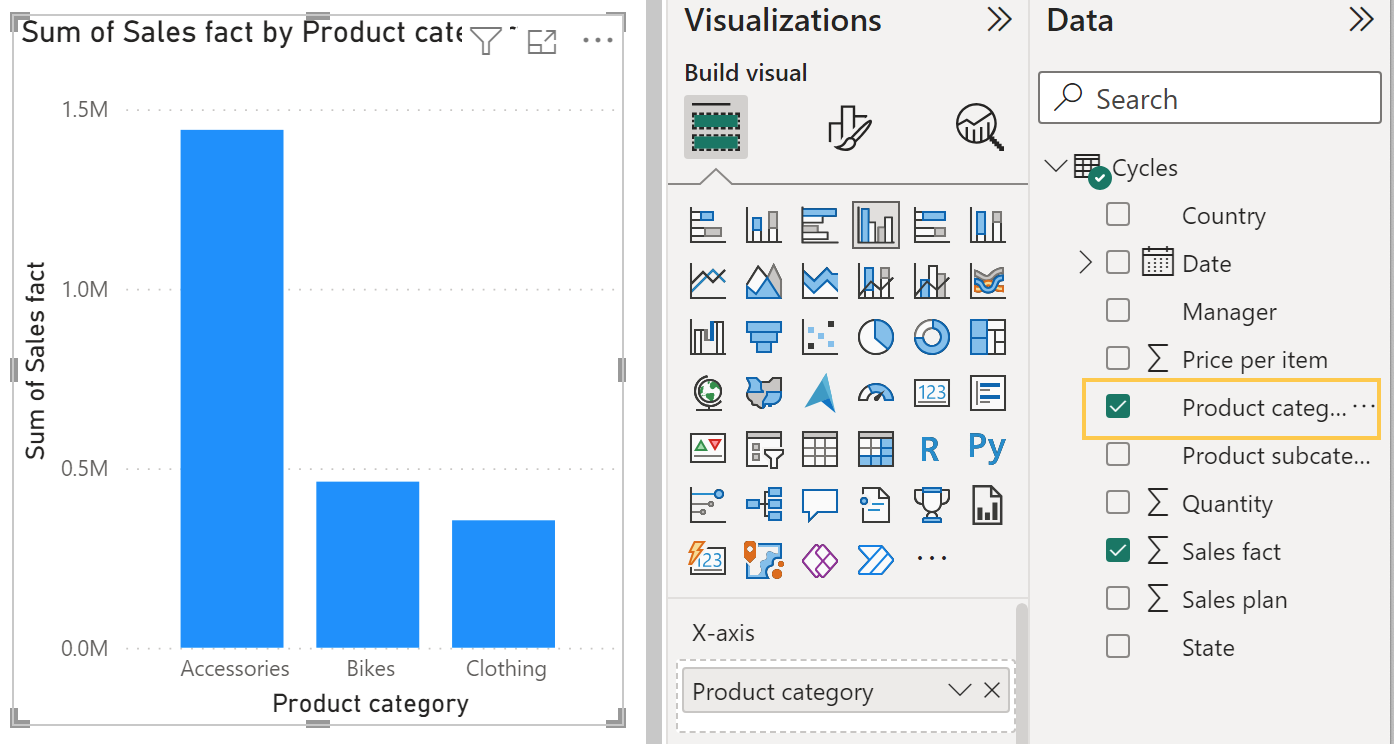 По умолчанию Power BI генерирует заголовок на основе названий выбранных полей, например, "Сумма факта продаж по категориям товаров". В нашем примере это вполне понятный заголовок. Но если бы мы выбрали еще два или три поля, заголовок занимал бы уже две строки, а согласно эмпирическому правилу, заголовок должен укладываться в одну строку. Кроме того, названия полей в исходных данных не всегда точно передают бизнес-контекст. Поэтому мы всегда редактируем заголовок и формулируем его максимально кратко и понятно. Например, в нашем случае, диаграмму на рисунке 1-17 мы бы назвали “Продажи по категориям”. Это можно сделать в соответствующем параметре “Заголовок диаграммы”.