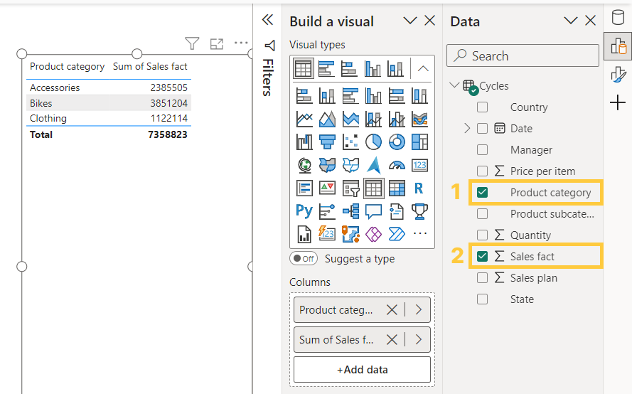 Power BI по умолчанию строит визуализации в зависимости от типа данных, выбранного первым: