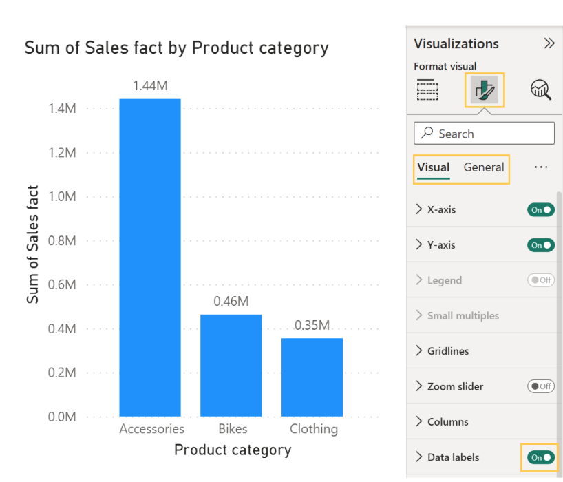 Вы уже узнали, что Power BI автоматически настраивает единицы измерения, что довольно удобно. Подписи из более, чем 4–5 цифр делают чтение неудобным. Сравните, например, диапазон 12 720 000 и 8 340 000 с 12,72 млн и 8,34 млн. Плюс ко всему полные значения могут не умещаться, и тогда метки совсем пропадут.