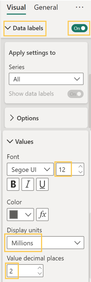 * Единицы измерения. По умолчанию здесь всегда стоит «авто». Это значит, что Power BI автоматически решает, в каких единицах отображать значения – тысячах, миллионах и миллиардах – в зависимости от диапазона значений, а также автоматически меняет их при изменении порядка данных. Но, вы можете задать единицы измерения вручную. Тогда они будут зафиксированы и ни при каких обновлениях или фильтрах не изменятся. Дополнительно можно указать десятичные знаки. Сейчас, для примера, настроим отображение меток данных в миллионах с двумя знаками после запятой.