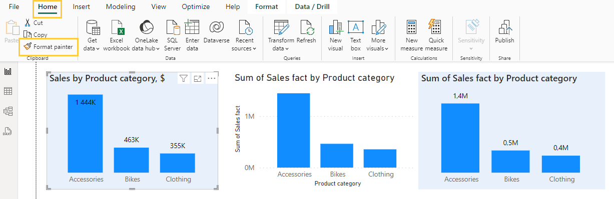 Некоторые параметры, такие как метки данных или формат заголовка, можно настроить по одним и тем же правилам для всех визуальных элементов или даже перенести форматирование, используя всего одну кнопку: при выделенном визуальном элементе на вкладке Главная верхней панели меню активируется кнопка Форматировать по образцу (Format painter) (рисунок 1-21); при ее нажатии и последующем клике на любой другой визуал на дашборде, к нему применяются все совместимые с ним настройки объекта, выделенного первым (рисунок 1-21 слева).