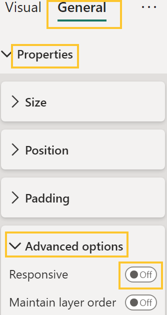 * Общие. Это настройки, которые встречаются во всех визуальных элементах, такие как заголовок, цвета фона, границы и другие. Важно отметить, что выполнять настройки необходимо для каждого элемента