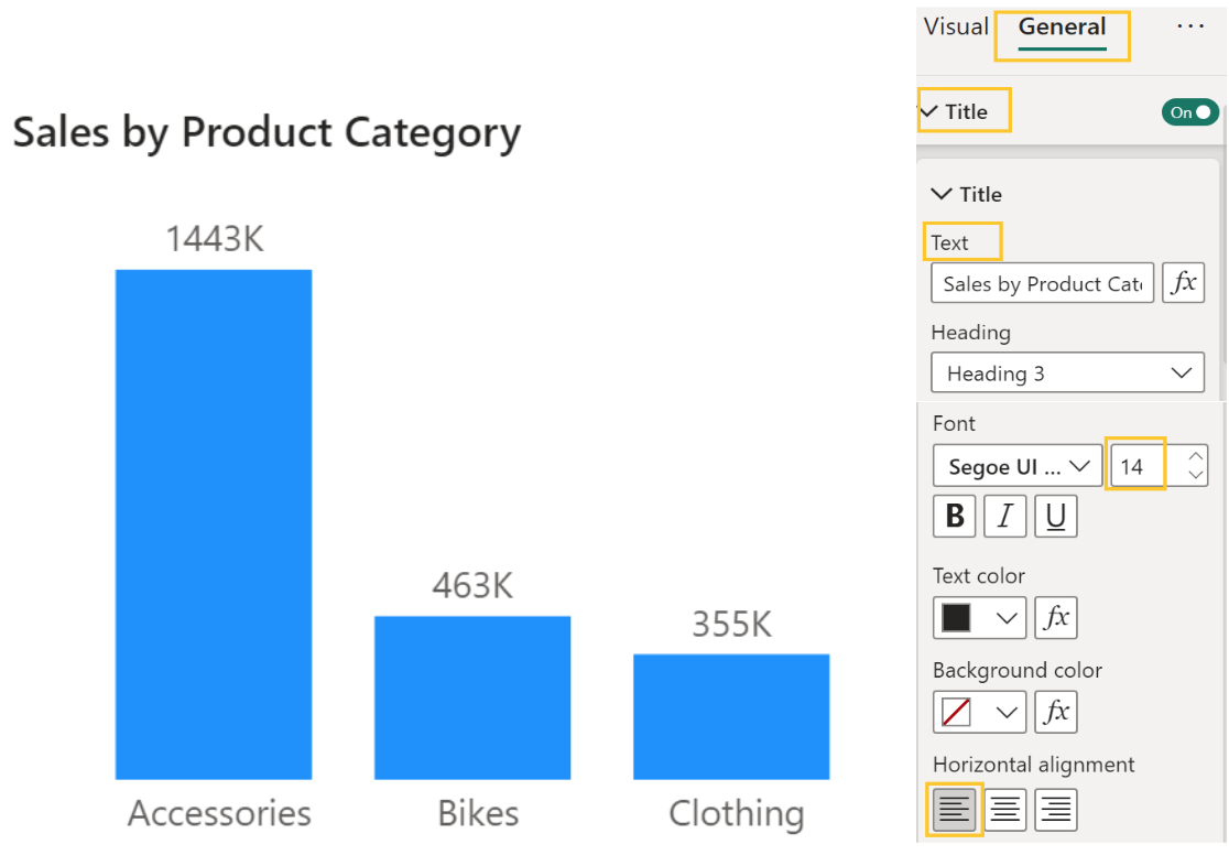 Заголовок должен быть крупнее, чем метки данных и категорий. Для этого хорошо подходит размер шрифта 14 пунктов. Сохраняйте горизонтальное выравнивание по левому краю.