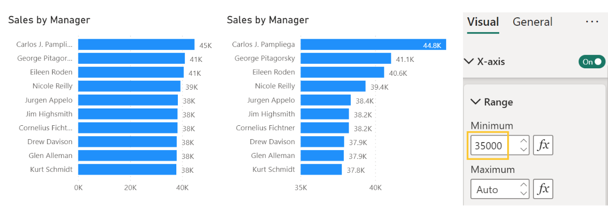 Давайте рассмотрим исключение из правила. Бывают случаи, когда разница в диапазоне данных минимальна, а столбцы (как вертикальные, так и горизонтальные) выглядят совершенно одинаково (рисунок 3–9 слева). В нашем наборе данных это произойдет, если мы будем сравнивать продажи по полю Manager (далее Менеджер). В таком случае мы можем изменить начало оси значений (X или Y) вручную. Тогда ось мы не отключаем – она покажет нам масштаб, чтобы было понятно, что разница между условным Ивановым и Петровым не трехкратная (рисунок 3–9 справа). Здесь важно понимать возможный диапазон числовых показателей с учетом возможных фильтров и минимальным ограничением по оси не отрезать часть данных.