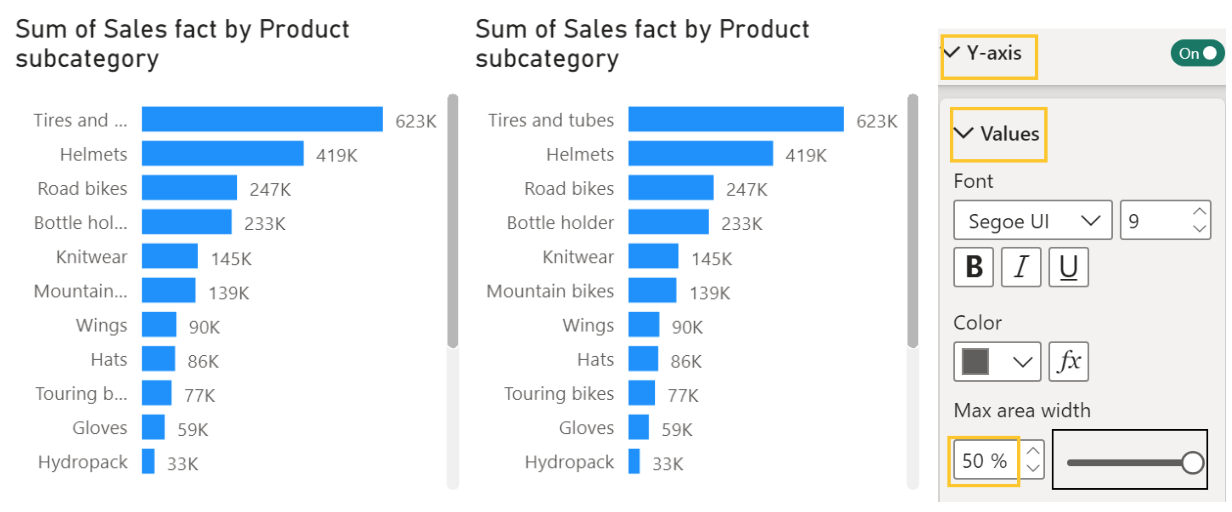Технически параметр оси категорий работает как и для столбчатой диаграммы, отличаясь только названием – ось X вместо оси Y. Но есть смысловая разница для параметра Максимальная ширина категории (Max area width) в разделе Значения (Values). Если мы начнем уменьшать ширину всего графика, текст будет обрезаться. Это не критично, если мы потеряем только несколько последних букв. Но, иногда, это может стать значимым барьером для восприятия данных пользователем. На рисунке 3-10 слева это наглядно показано – названия категорий сокращены до непонятных “Tires and…, “Mountain…” и т. д.
