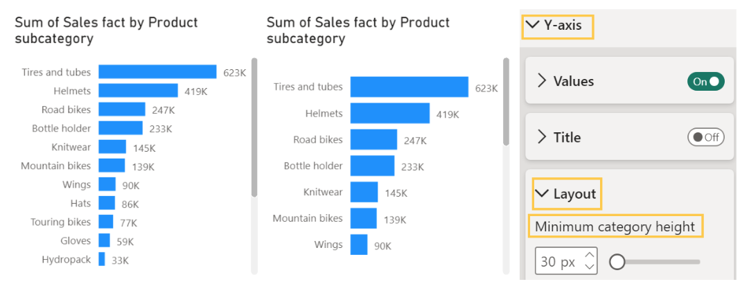 Если мы начнем уменьшать высоту графика, то в определенный момент справа появится полоса прокрутки. Это также может произойти со столбчатыми диаграммами, если сжимать их по горизонтали. Хорошо, что Power BI не позволяет нам бесконечно «сплющивать» полосы и столбцы и всегда сохраняет ширину оптимальную для чтения. Но как управлять этим параметром?