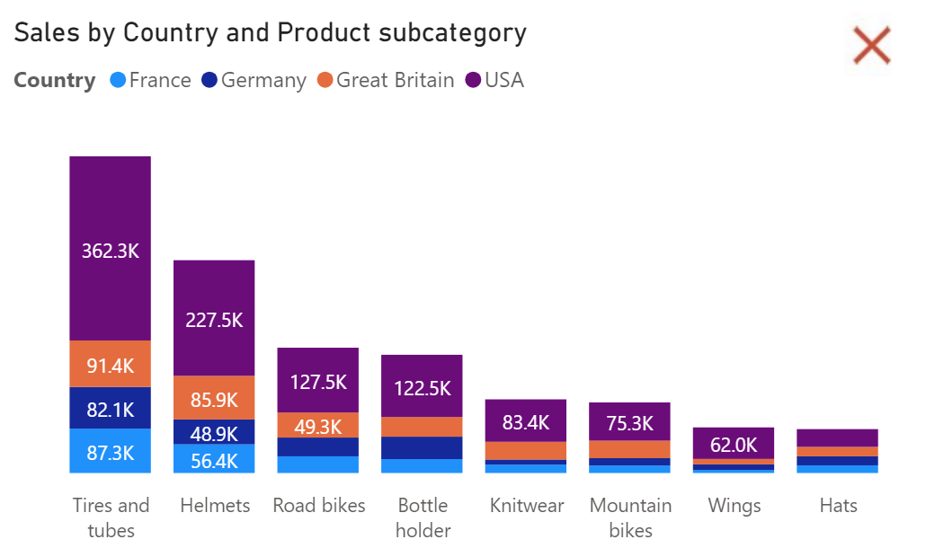 Представьте, что вы хотите отобразить продажи для различных подкатегорий по странам. Если вы создадите диаграмму со сложенными столбцами, она может стать загроможденной: мы можем сравнить высоту и пропорции двух первых категорий, но в остальных сектора по странам превращаются в тонкие полоски, на которые даже не помещаются метки данных (рисунок 3-14).