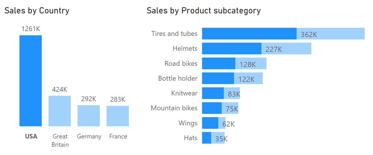 В обратную сторону перекрестная фильтрация работает таким же образом: если мы выберем столбец Helmets на правой гистограмме, то на левой подсветятся продажи этой товарной категории во всех странах.