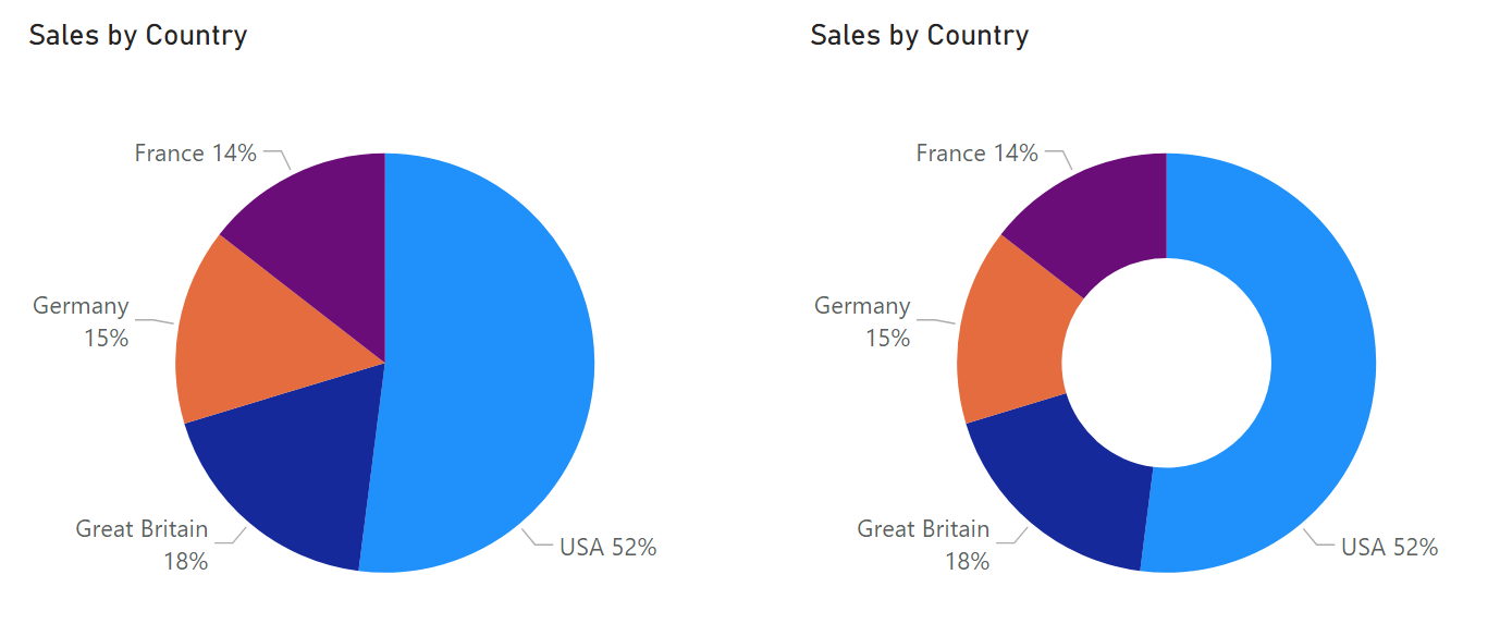 По умолчанию радиус внутреннего круга составляет 60 %. Не советуем его увеличивать. На рисунке 4–5 слева показан вариант с радиусом 80 %. На нем сама визуализация стала слишком тонкой, а доминирующее пустое пространство переключает на себя внимание и читателю сложно сфокусироваться на данных. Мы рекомендуем оставить радиус по умолчанию или уменьшить его до 50 % (рисунок 4–5 справа). Так диаграмма будет выглядеть сбалансированно.