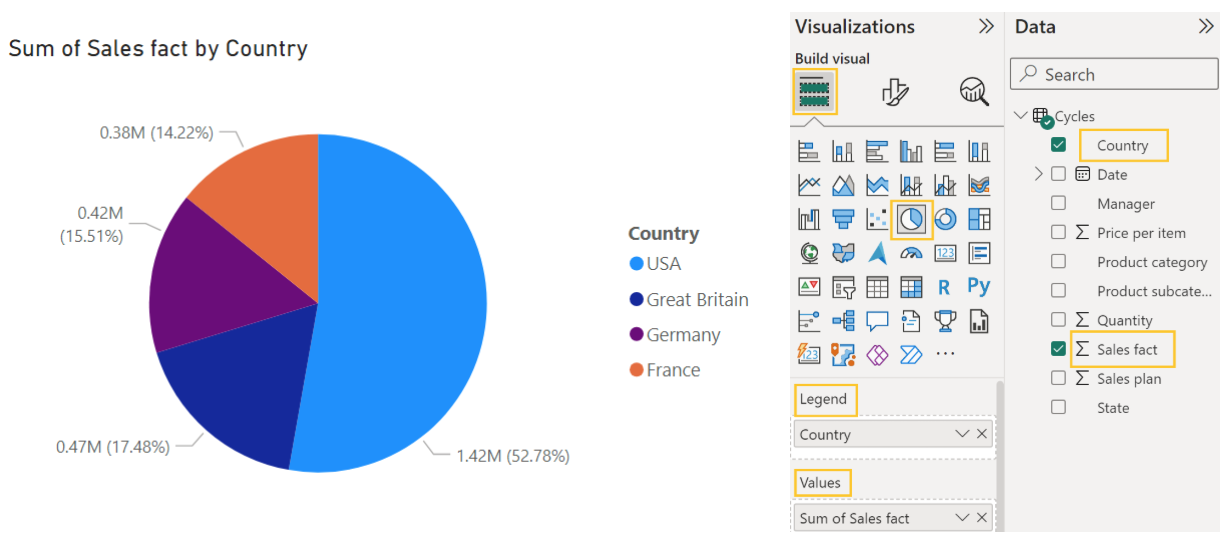 Построить круговую диаграмму очень просто: помещаем категории (Страны) в поле Условные обозначения (Legend), а количественный показатель (Продажи факт) – в поле Значения (Values). Оформление по умолчанию выглядит не так уж плохо (рисунок 4–2):