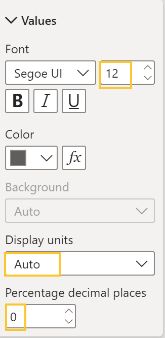 Значения (Рисунок 3–4). Этот параметр часто нуждается в настройке. Как правило, вам следует изменить стиль шрифта и цвет меток, а размер шрифта, выставленный по умолчанию 9 пт, увеличить до 10–12 пт в зависимости от размера диаграммы и возможностей Power BI сохранить заданный нами размер шрифта (см. главу 1, режим реагирования).