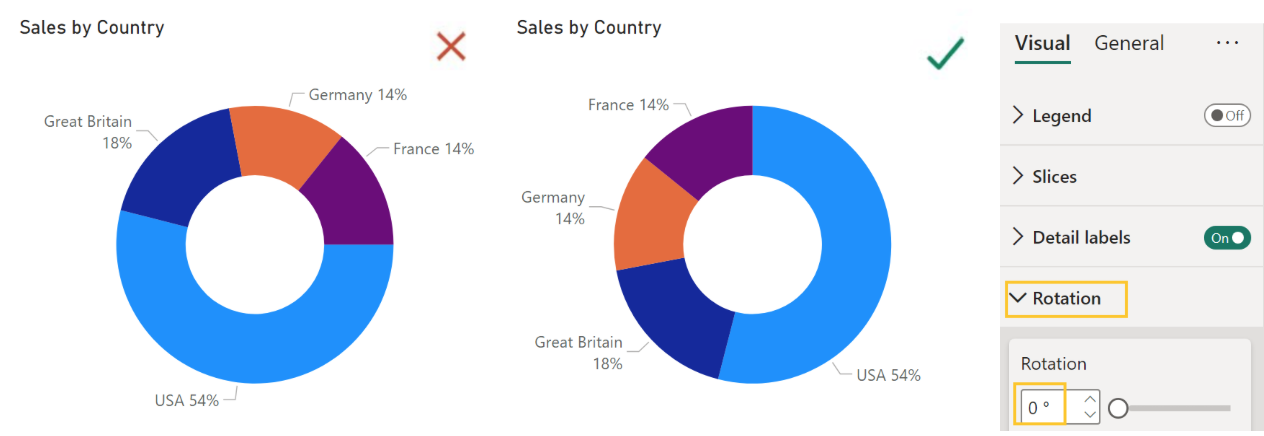 Поворот (Rotation) – это последний параметр на панели настройки визуализации, который есть как у круговых, так и у кольцевых диаграмм.