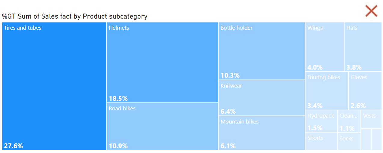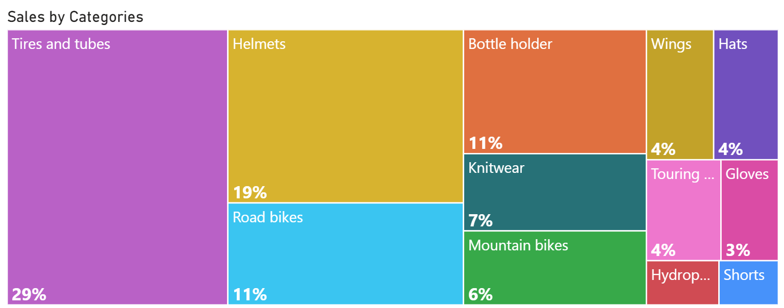 Перейдем к настройке форматирования. Что мы хотим улучшить в дефолтной версии диаграммы (рисунок 5–4)? Во-первых, мы должны добавить метки данных. Без них сложно визуально оценить долю даже самых крупных товаров. Tires and tubes составляют 20 % или 30 % от объема продаж? Доля Road bikes составляет 10 % или 20 %? Во-вторых, диаграмма выглядит слишком яркой, а некоторые секторы настолько светлые, что белый текст на них читается с трудом.