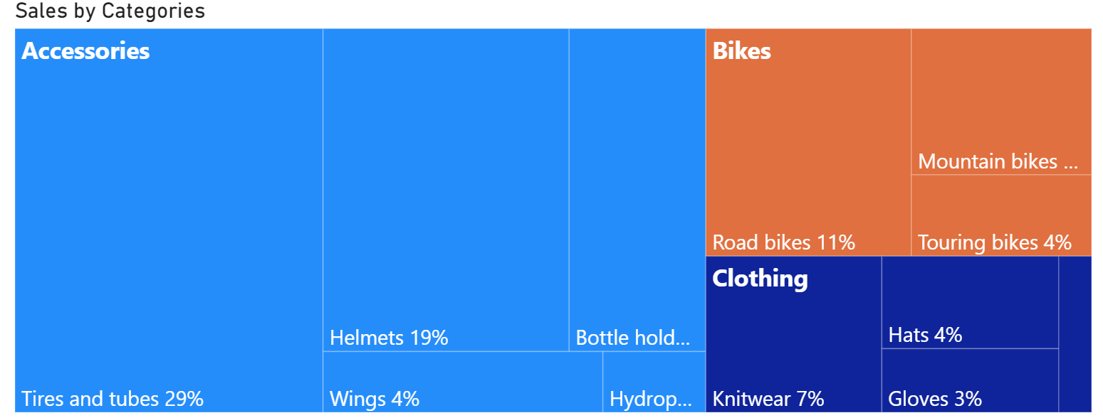 2. В случае работы с двумя уровнями категорий нигде не отображается числовое значение верхнего уровня агрегации. Иначе говоря, мы видим только метки данных подкатегорий, а сколько они вместе составляют в той или иной категории – непонятно. Согласитесь, что в примере на рисунке 5–2 трудно навскидку определить, сколько приходится на Accessories – 60 % или, может быть, 75 %. Хоть мы и можем в уме сложить значения подкатегорий, было бы полезнее, если бы визуализация помогала нам в этом.