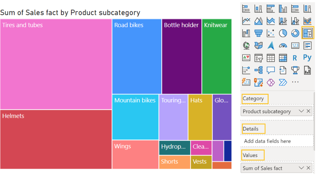 Построить тримап также просто, как и круговую диаграмму. Начнем с одноуровневого примера: поместите Продажи факт в поле Значений, которое определяет площадь прямоугольника, а Подкатегория продукта в поле Категория. В случае одноуровневой диаграммы вы также можете поместить поле для категории в поле Детализация – в любом случае, у вас получится разноцветный «ковер» как показано на рисунке 5–4.